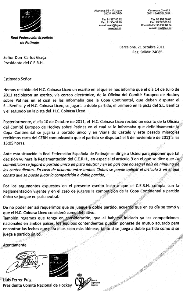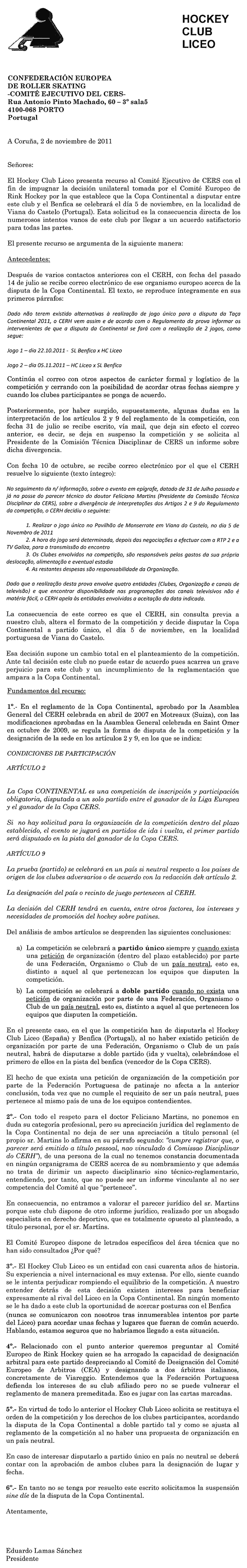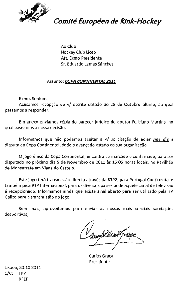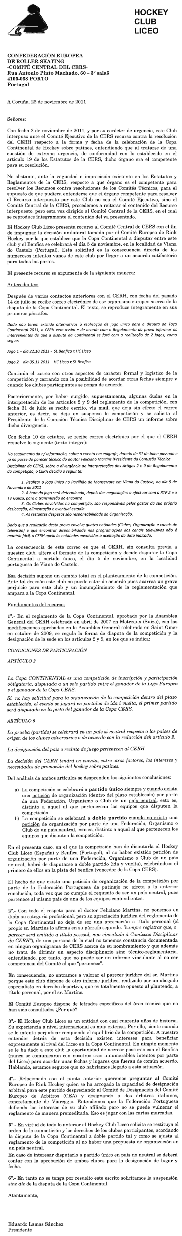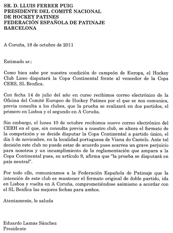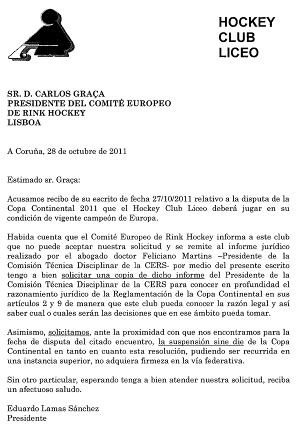 Quase logo de seguida (8 dias depois) o Liceo envia à RFEP um documento