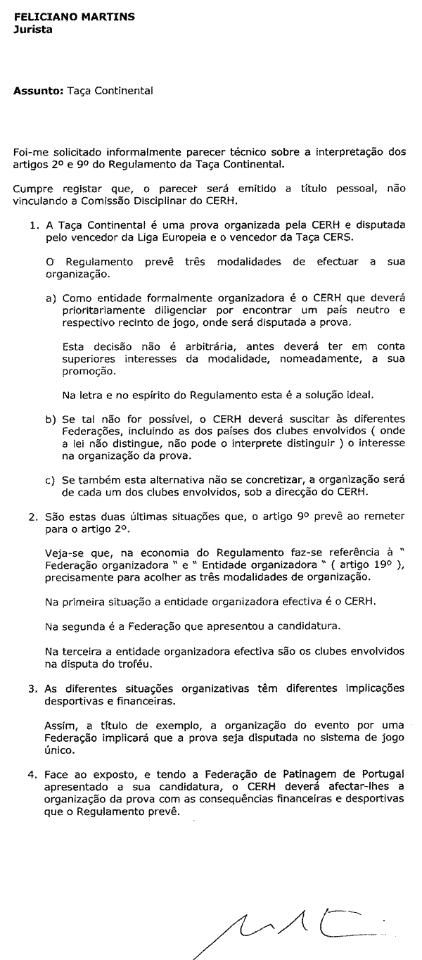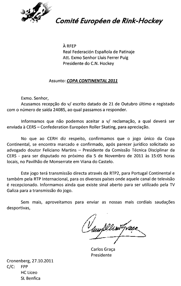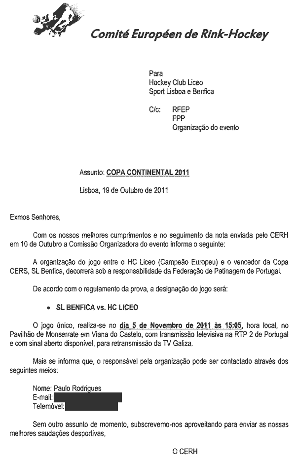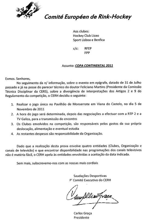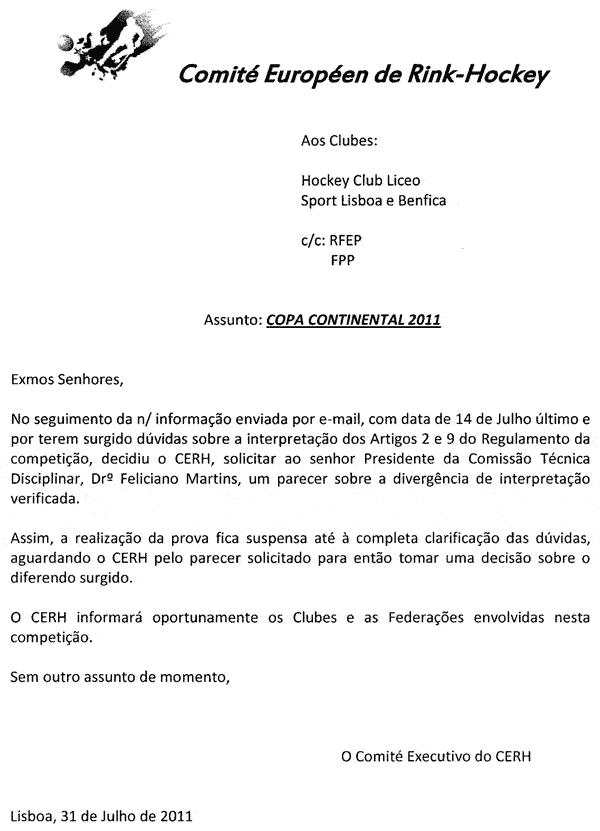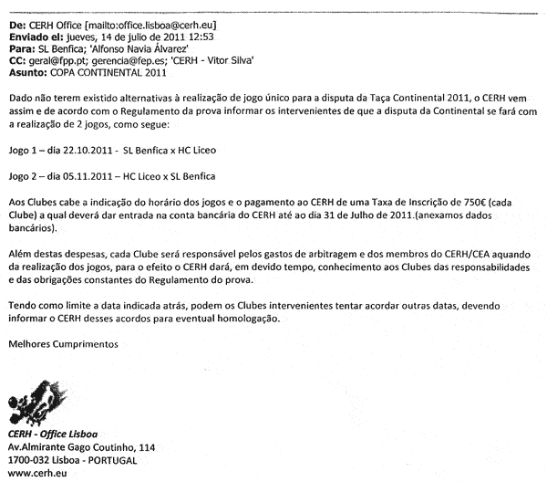A 14 de Julho, o CERH envia ofício ao Benfica e ao Liceo (com conhecimento à
